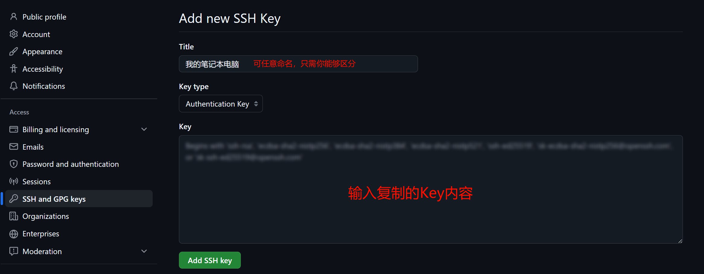 - 进入github网页登录账号,点击右上角头像 - settings - SSH and GPG keys,名字随便起,复制的公钥内容填到Key那一栏