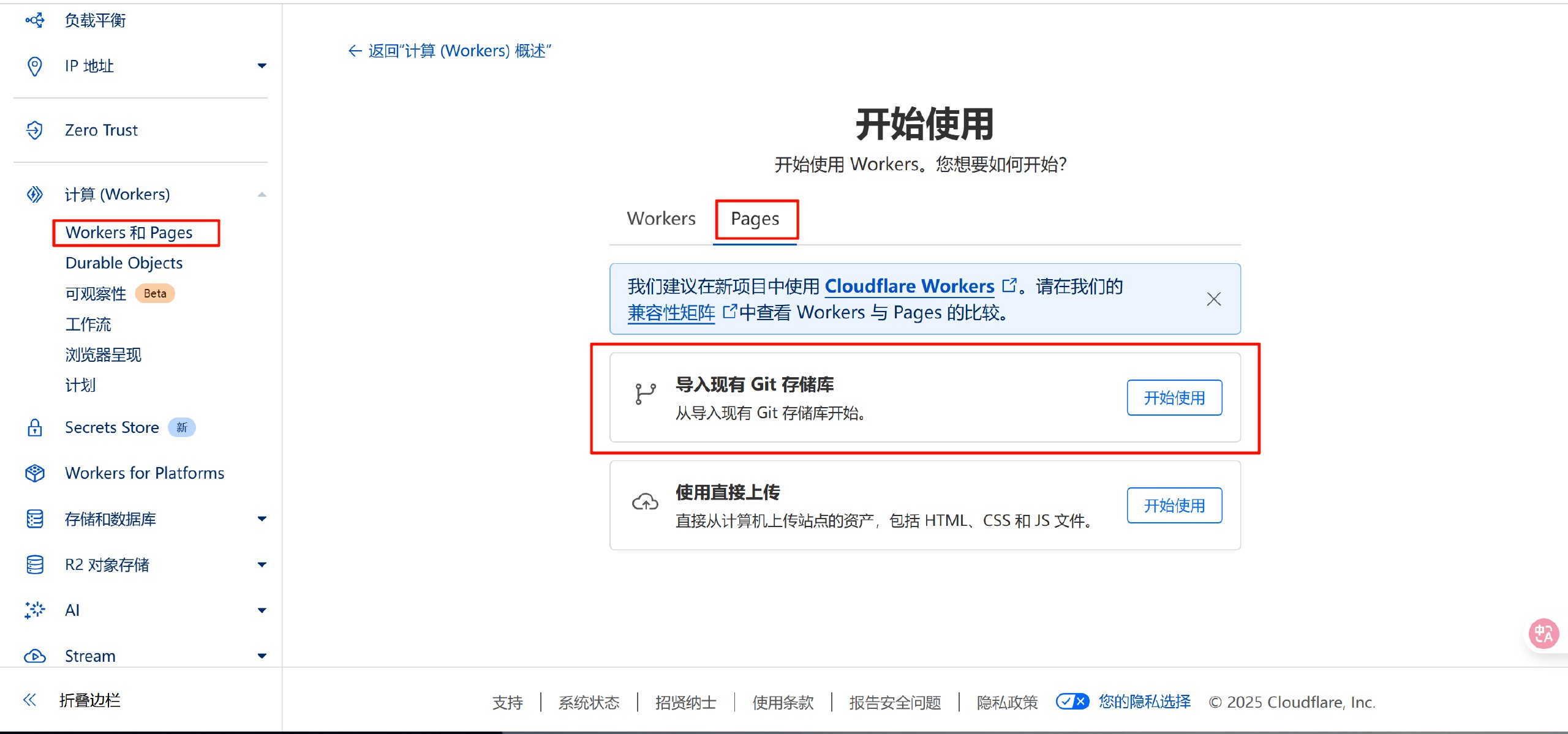 计算 (Workers)-Workers 和 Pages-创建一个新项目 - 选择Pages-导入现有 Git 存储库连接到 Git