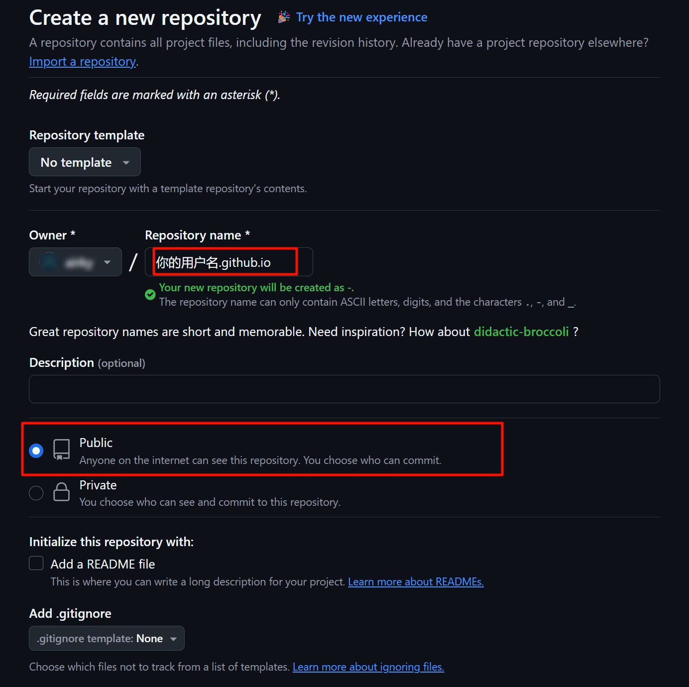 New repository,创建一个<你的用户名>.github.io的仓库仓库名字的格式必须为:<你的用户名>.github.io (注意:前缀必须为用户名,此为预览博客需要,后期可修改仓库名)