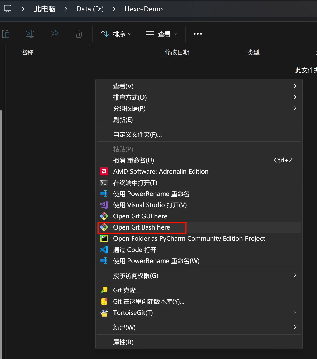 D:/Hexo-Blog),在文件夹内右键鼠标,选择Open Git Bash here