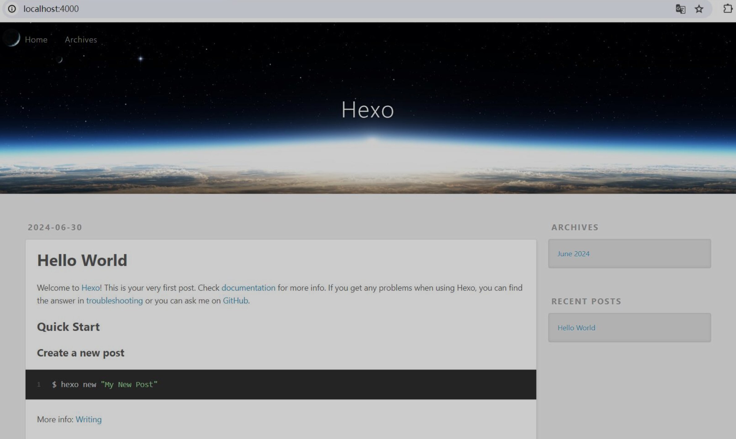 打开浏览器,输入输出的地址:http://localhost:4000/ ,看到下面的效果,说明你的Hexo博客已初始化