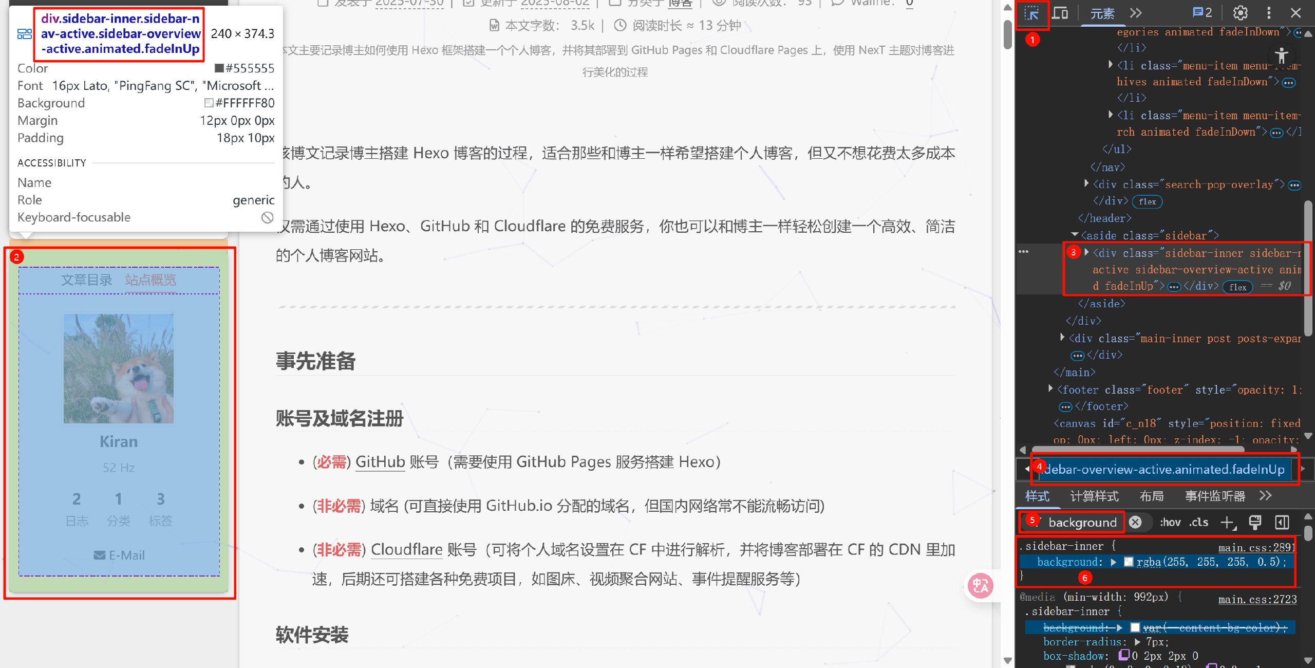 浏览器打开你的博客网页,按下F12打开控制台界面,点击图中①的元素选择器,悬停在你想要查看元素的地方(如图中②处),点击后③处会显示该元素的代码,其中class中的空格前的即为元素名(sidebar-inner),你可修改上面透明度设置的元素名尝试是否生效,也可通过图中⑤处搜索是否有background属性,并在图⑥处进行修改预览,最后应用还需按上面透明度设置的方法写入styles.styl才能生效